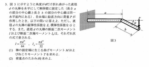 今回は下の画像の問題について解説をしたいと思います。 ちなみにこのθが90°のときは東大院と東北大院に出題されています。 それでは問題の解説をしていきたいと思います。 解答本文 (1)固定端に生じるモーメントを求める問題 (2)荷重点のたわみを求める問題…