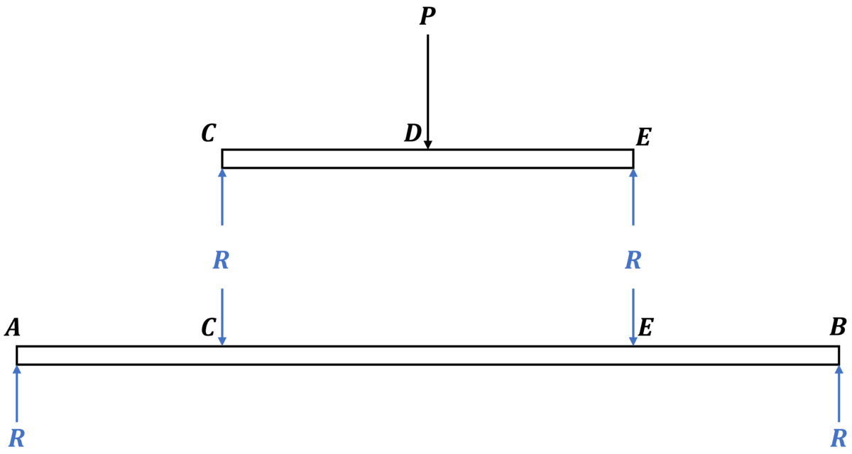 対称性と力のつり合いから点C、E、A、Bにおける反力はすべて等しいです。この値をRとすると