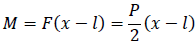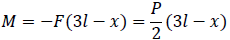 梁CEを座標xの位置で切断して力およびモーメントのつり合いを考えます。l≦x≦2lのとき、断面に生じるせん断力および曲げモーメントをそれぞれF、Mとすると断面より左側の部分における力のつり合いよりFは